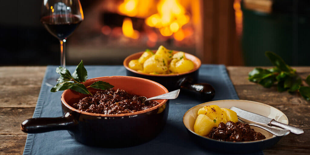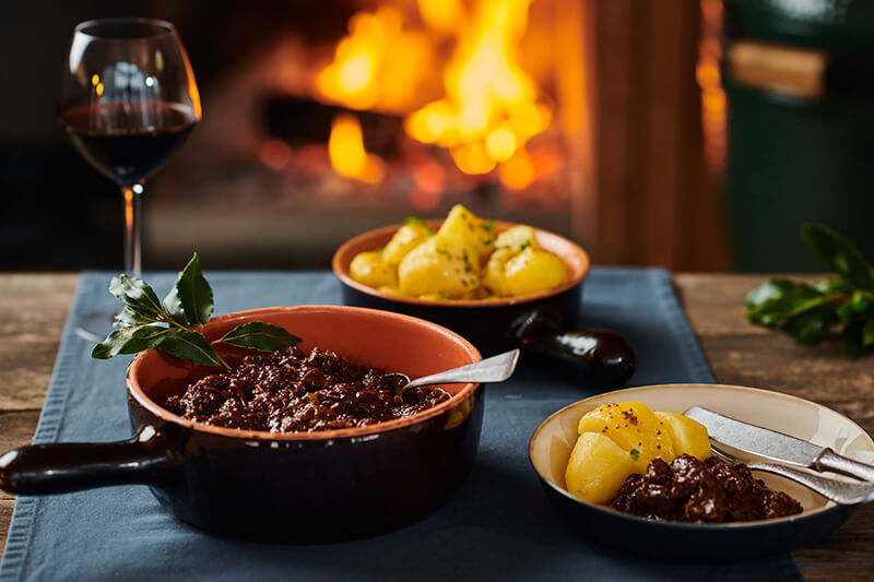 Išimkite keptuvę su troškiniu iš „Big Green Egg“ ir patiekite šį troškinį, pavyzdžiui, su virtomis miltingomis bulvėmis, ištirpintu sviestu ir susmulkintomis petražolėmis.