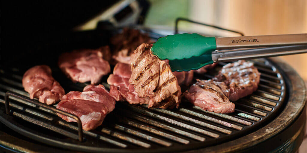 2. Iškeptus gabalus padėkite ant pjaustymo lentelės. Nuimkite groteles ir uždėkite nerūdijančio plieno groteles „EGG“ kepsninėje. Ant viršaus uždėkite Žalią ketaus puodą, uždarykite „EGG“ dangtį ir apie 5 minutes kaitinkite puodą. Tuo tarpu supjaustykite gabalus kubeliais.
