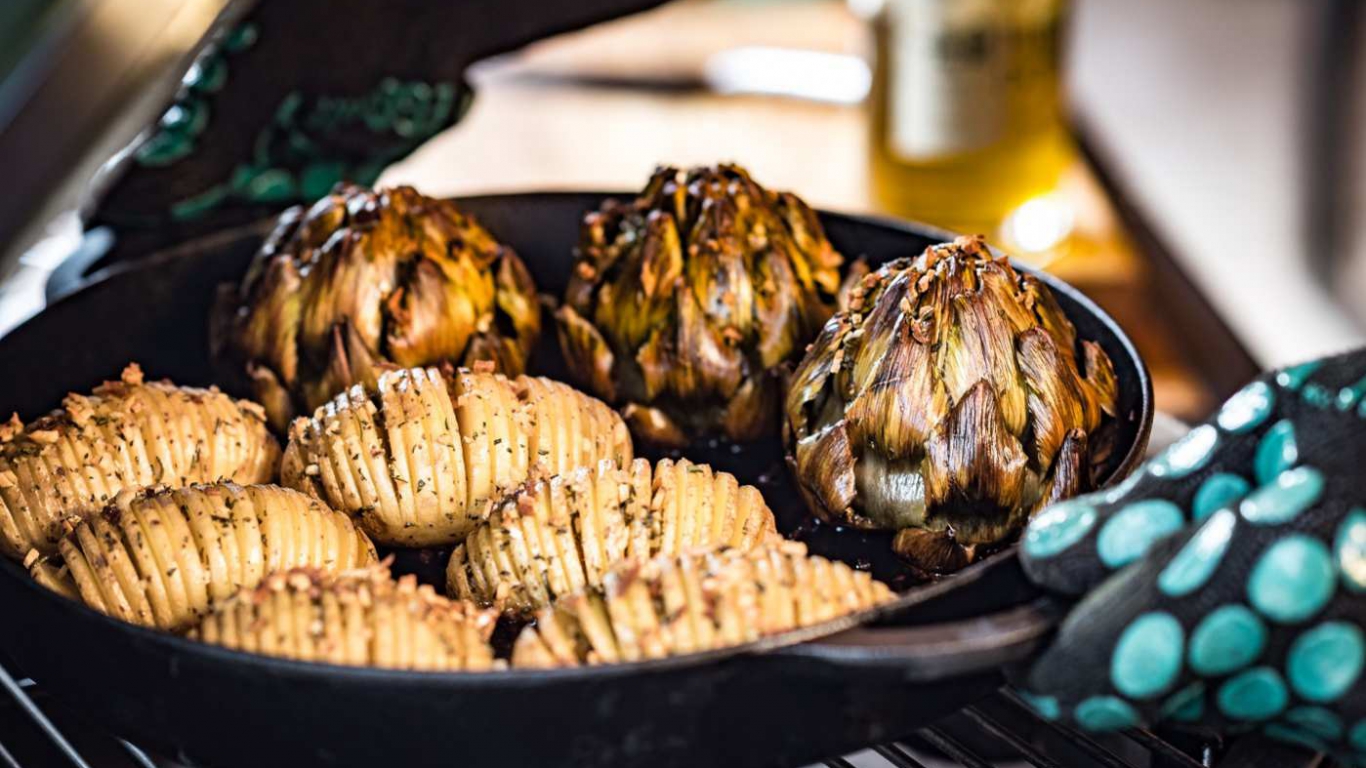 Norėtumėte Big Green Egg kepsninėje iškepti daugiau daržovių? Šie gardūs artišokai gaminami pagal panašų receptą. Juos galite kepti drauge su bulvėmis toje pačioje keptuvėje.