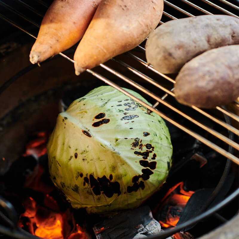 2. Po 45 minučių įdėkite „convEGGtor“ krepšelį ir ant jo uždėkite pusines nerūdijančio plieno groteles. Ant grotelių sudėkite saldžiąsias bulves ir uždenkite kamado dangtį. Kepkite saldžiąsias bulves apie 45 minutes, kol jos suminkštės. Tuo metu kopūstai taip pat toliau kepa; dėka pusinių grotelių juos galite lengvai apversti.