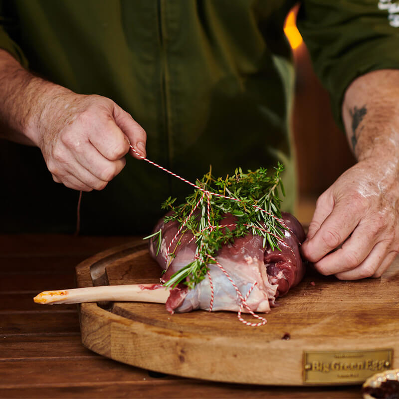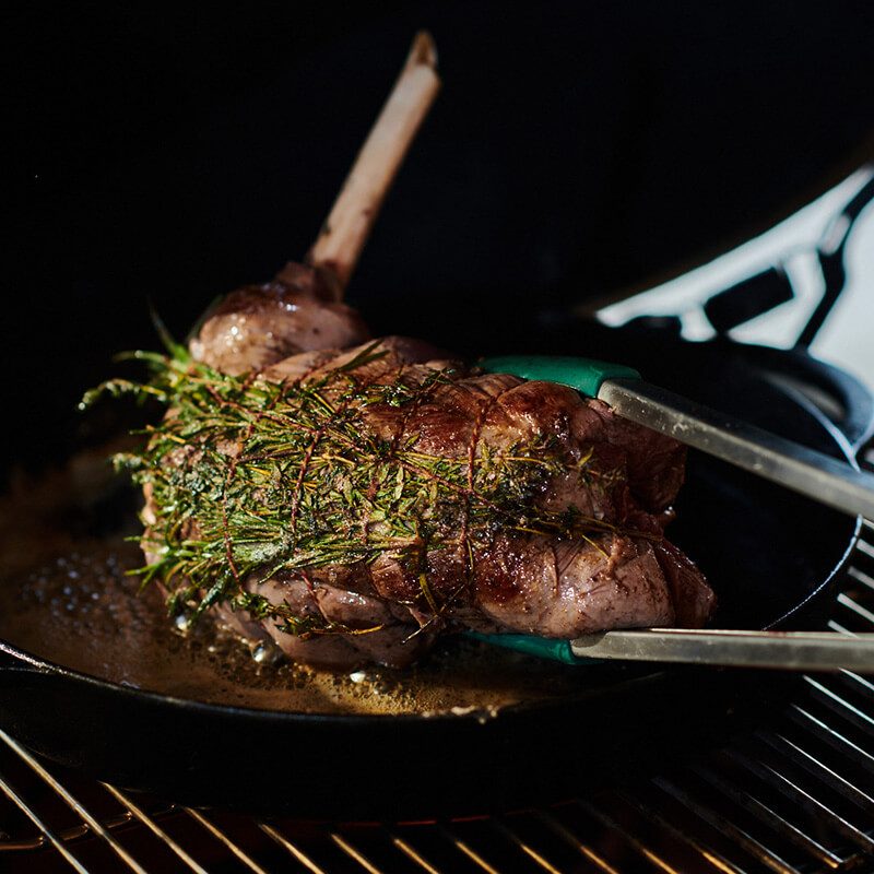 12. Ištraukite keptuvę iš „Big Green Egg“, ant jos išdėliokite elnienos šlaunelę ir padėkite keptuvę ant stalo ant karščiui atsparaus paviršiaus.