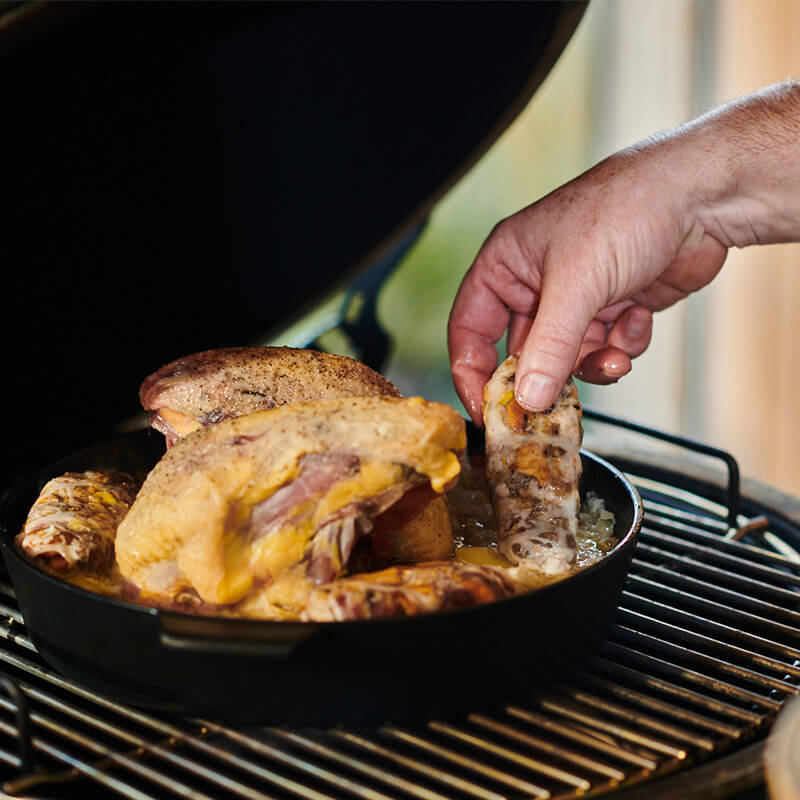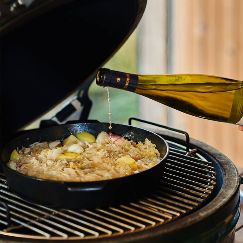 Norite išsikepti fazaną ant Big Green Egg kepsnins ir ieškote skanaus recepto? Fazanai ir rauginti kopūstai – tai išbandytas ir patikimas derinys. Prancūzijos Elzaso regione ir kaimyninėse vietovėse tai yra tikrų tikriausias klasikinis patiekalas. Ten su raugintais kopūstais patiekiami ir kiti medžiojamieji paukščiai. Tai gardus viename puode gaminamas patiekalas, skirtas kamado kepsninėms. Kadangi šlaunelių mėsa yra gausiai raumeninga, supjaustykite ją plonais gabalėliais kaip tartaro mėsą ir kartu su miško grybais suvyniokite su taukų plėve. Kepant dalis taukų plėvės išsilydys, todėl mėsos mišinys taps minkštas ir sultingas.