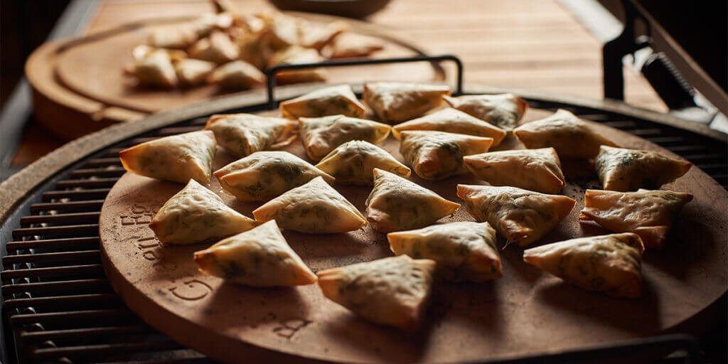 Ar kada nors ragavote samosų? Šio vegetariško recepto dėka nuo šiol šį skanų užkandį, kuriame jūsų pasirinktas įdaras suvyniotas į skanius traškius filo tešlos sluoksnius, galite pasigaminti savo Big Green Egg. Paprastai samosos yra keptos aliejuje, tačiau dėl papildomo kamado skonio jos tampa dar skanesnėmis!