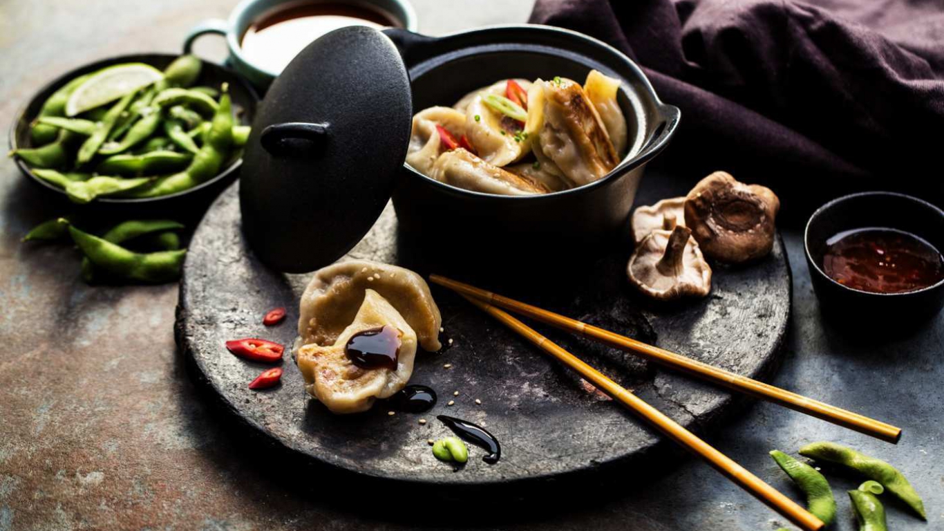 4. Išimkite koldūnus iš Big Green Egg kepsninės ir patiekite su sojų ir aitriųjų paprikų padažais.