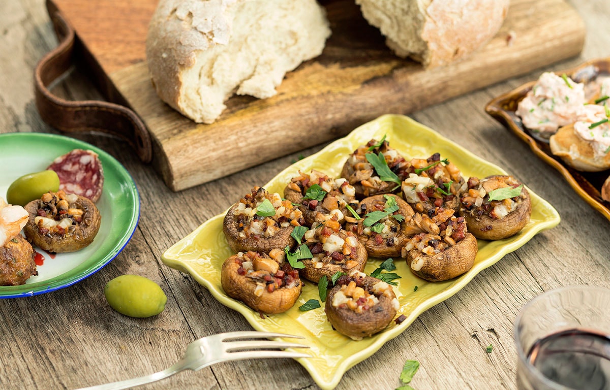 Planuojate valgyti tapas? Tuomet būtinai Big Green Egg kepsninėje išsikepkite įdarytų grybų. Juos galite paruošti iš anksto ir uždengtus laikyti šaldytuve. Prieš pat patiekdami prikimškite grybų kepurėles įdaro ir kepkite maždaug 8 min.
