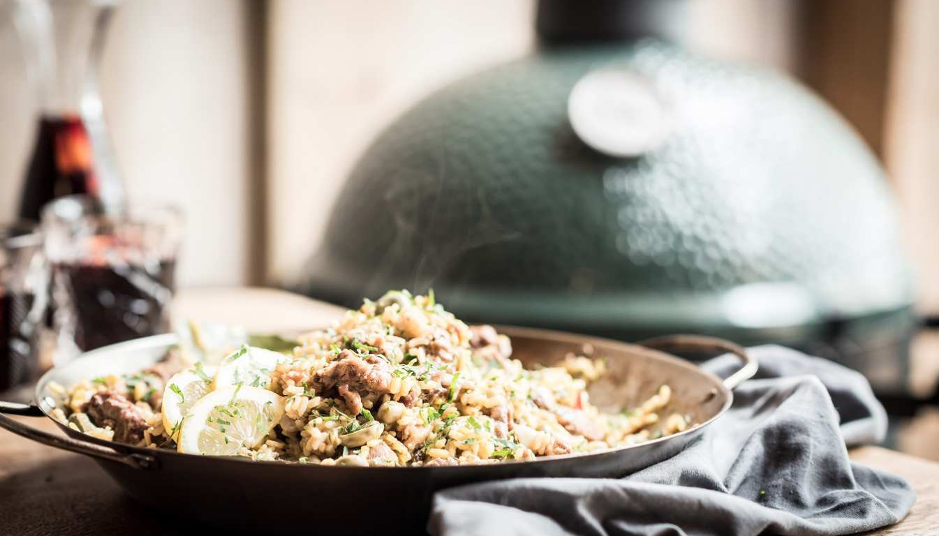 Išimkite migdolų pyragą iš Big Green Egg kepsninės ir atvėsinkite. Tuo tarpu paruoškite kepsninę paelijai ir įkaitinkite iki pageidaujamos temperatūros.