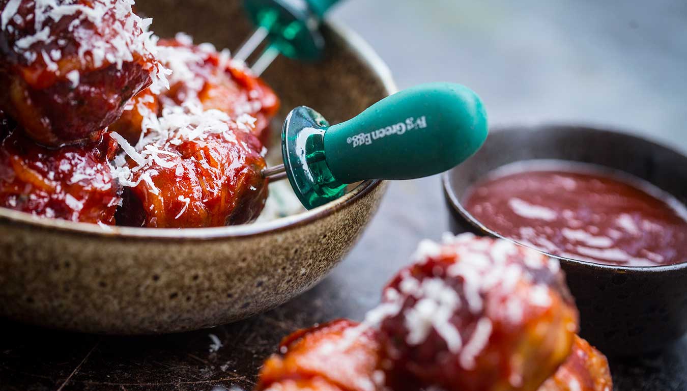 4. Išimkite kukuliukus iš Big Green Egg kepsninės. Ištraukite medinius smeigtukus, o kukuliukus išdėliokite gražioje lėkštėje ir apibarstykite likusiu parmezanu. Kukuliukams pasmeigti naudokite kukurūzų laikiklius.