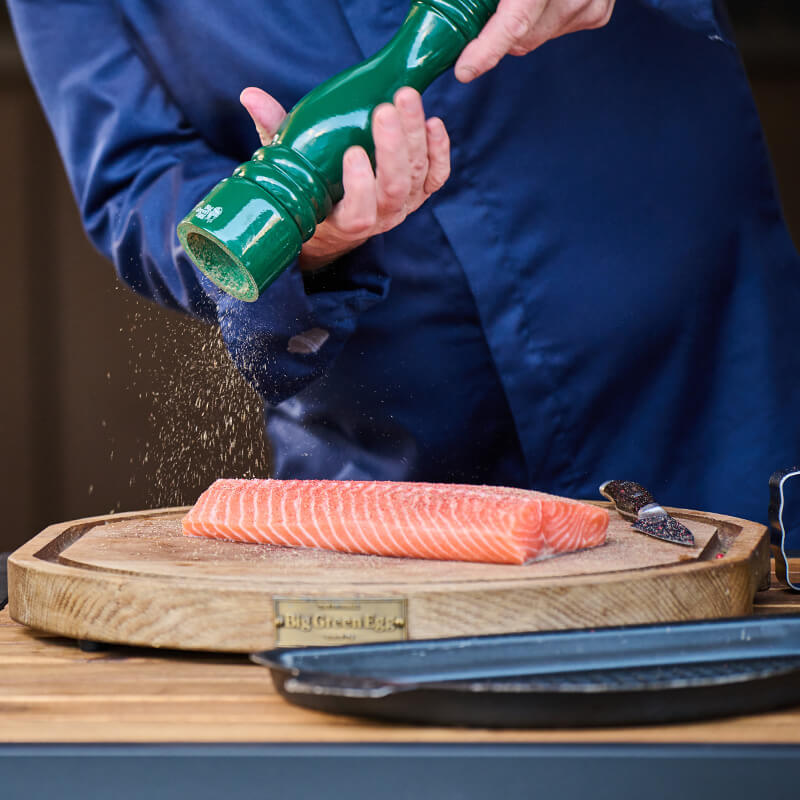 Uždekite anglis „Big Green Egg“ kepsninėje ir įkaitinkite iki 140°C. Padėkite lašišos filė oda žemyn ant stalviršio ir ištraukite likusias ašakas.