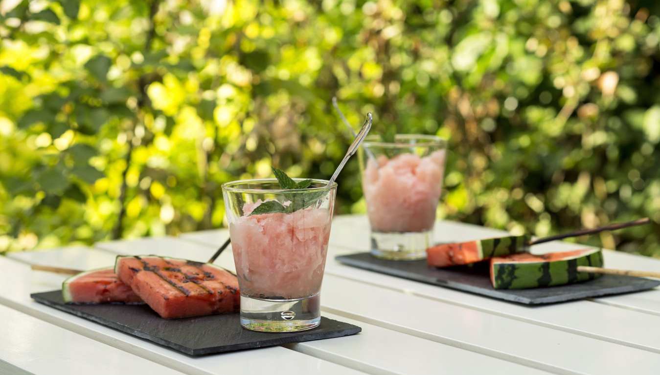Į šaldiklį įdėkite keturias stiklines. Naudodami grotelių kėliklį išimkite iš EGG kepsninės nerūdijančio plieno groteles ir Pit Mitt BBQ pirštine išimkite convEGGtor laikiklį. Kėlikliu įdėkite į kepsninę ketaus groteles, uždarykite dangtį ir įkaitinkite kepsninę iki 200 °C. Supjaustykite abi arbūzo skiltis į keturias riekeles ir pasmeikite jas ant iešmelių, kad išeitų savotiški saldainiai ant pagaliuko. Trumpai paskrudinkite arbūzo gabalėlius iš abiejų pusių ir, jei norite dailaus grotelių rašto, vis pasukite juos po ketvirtį rato į kairę arba dešinę.