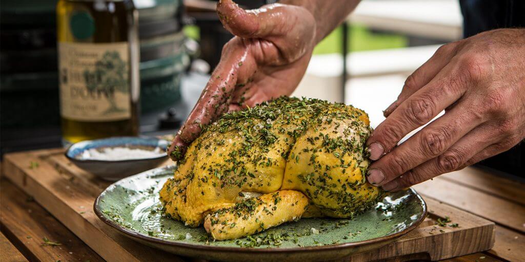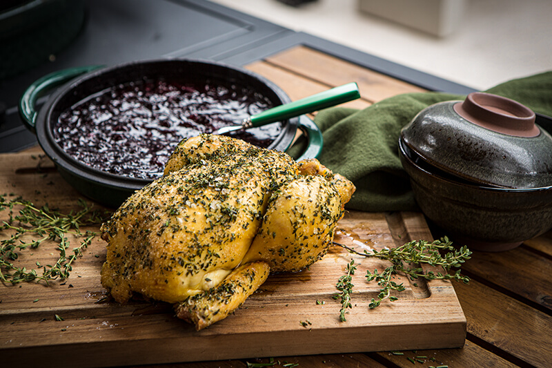 Šis kepto viščiuko receptas nereikalauja mėsos marinuoti ar gardinti prieskonių mišiniu. Čiobreliai vištienai suteikia labai gardų skonį. O prie mėsos puikiai dera Big Green Egg kepsninėje pagamintas uogų padažas.