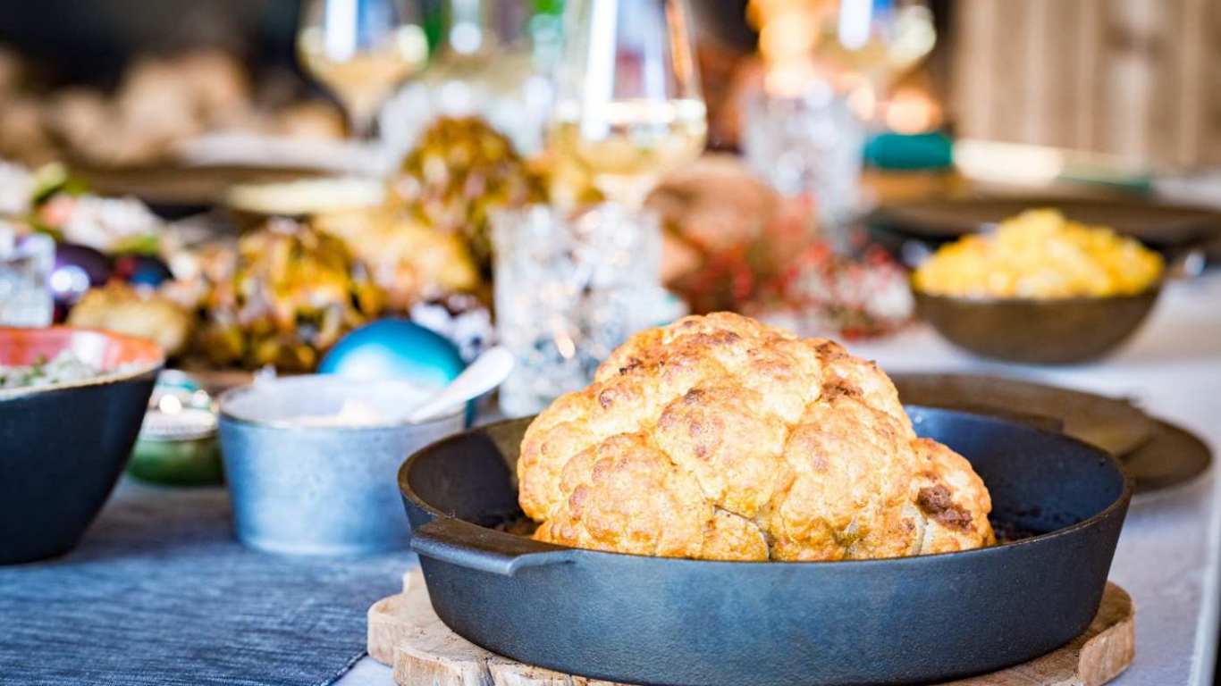 2. Išimkite keptuvę su žiediniu kopūstu iš Big Green Egg. Uždėkite keptuvę ant karščiui atsparaus paviršiaus ir patiekite su grietine. Prieš patiekdami supjaustykite žiedinį kopūstą riekelėmis.
