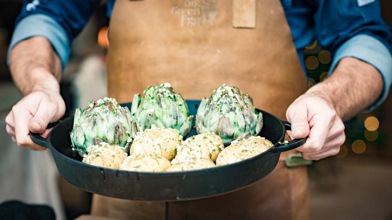 Dauguma receptų nurodo artišokus virti. Bet ar žinojote, kad juos galima lengvai pagaminti Big Green Egg kepsninėje? Keptų artišokų skonis ryškesnis, be to, jie įgauna malonaus tik Big Green Egg suteikiamo aromato. Patiekite artišokus su naminiu Big Green Egg kepsninėje gamintu pagardu, pavyzdžiui, šafrano padažu.