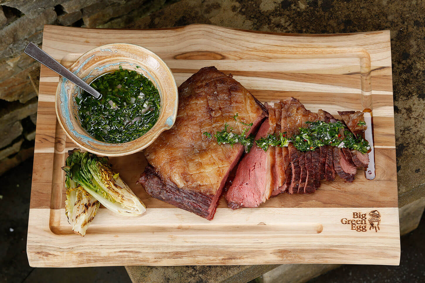 4. Nuimkite mėsą nuo grotelių ir palikite ją pastovėti 10 min. Tuo tarpu paruoškite garnyrą, pavyzdžiui, ketvirčiais supjaustytas romanines salotas „Little Gem“. Paskrudinkite jas ant ketaus grotelių po maždaug 2 min. iš visų pusių. Prie kumpio taip pat labai tinka chimichurri, petražolių ir česnakų padažas, pagardintas actu.