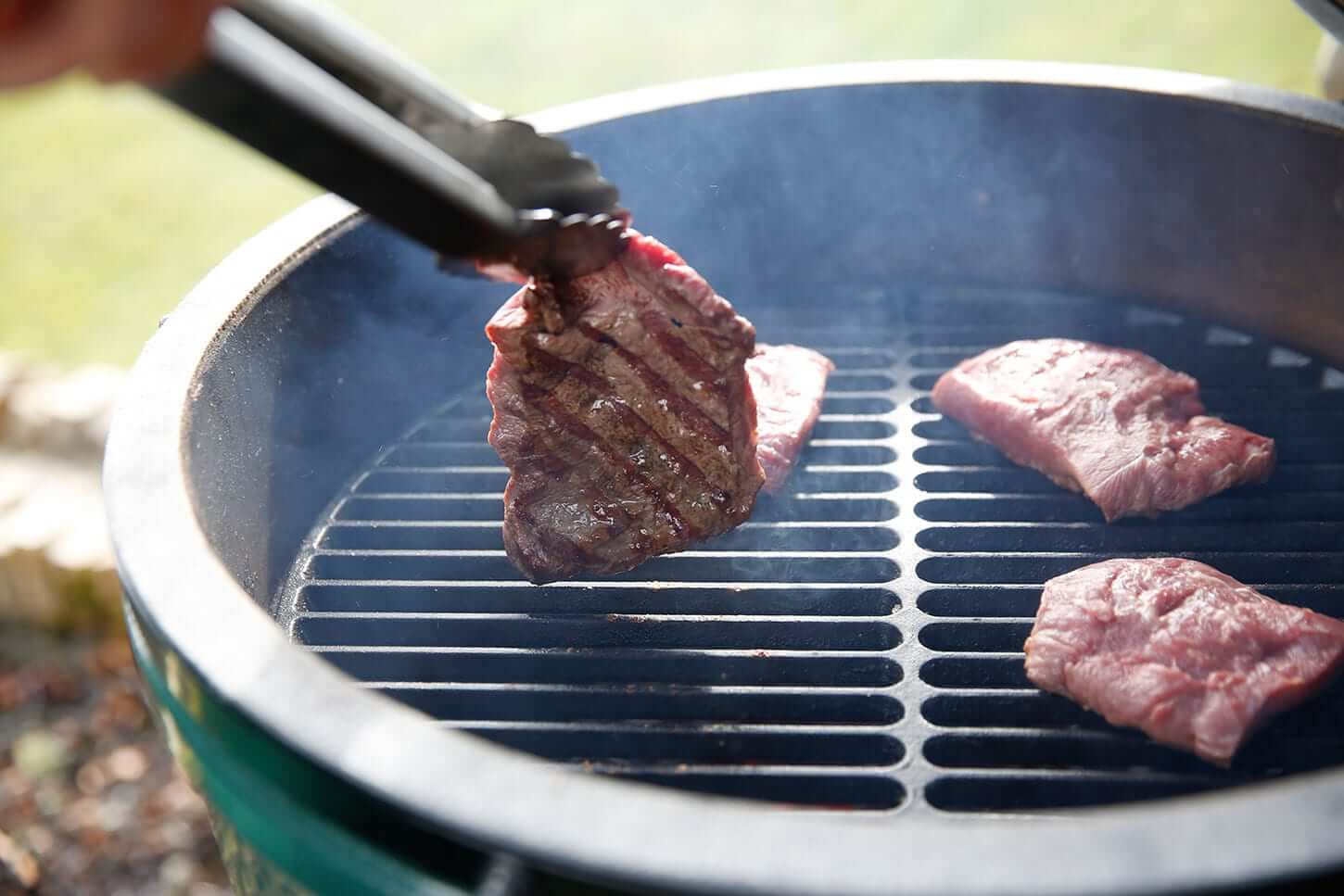 1. Uždėję ketaus groteles įkaitinkite Big Green Egg kepsninę iki 240–250 °C. Nepjaustytoje mentėje per vidurį yra kieta sausgyslė ir tvirtas riebalų sluoksnis. Aštriu peiliu perpjaukite mentę horizontaliai iš karto virš vidurinio sluoksnio ir pašalinkite sausgyslę ir riebalų sluoksnį. Jums liks dvi plokščios mėsos pusės. Nuopjovas galima panaudoti troškiniui arba padažui. Abi puses perpjaukite per pusę vertikaliai – turėsite keturis kepsnius.