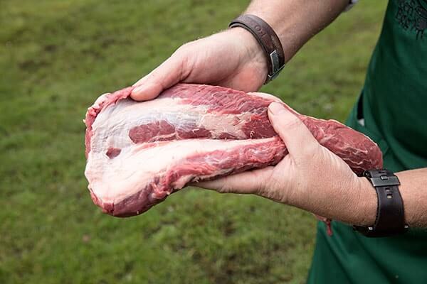 1. Uždėję ketaus groteles įkaitinkite Big Green Egg kepsninę iki 240–250 °C. Nepjaustytoje mentėje per vidurį yra kieta sausgyslė ir tvirtas riebalų sluoksnis. Aštriu peiliu perpjaukite mentę horizontaliai iš karto virš vidurinio sluoksnio ir pašalinkite sausgyslę ir riebalų sluoksnį. Jums liks dvi plokščios mėsos pusės. Nuopjovas galima panaudoti troškiniui arba padažui. Abi puses perpjaukite per pusę vertikaliai – turėsite keturis kepsnius.