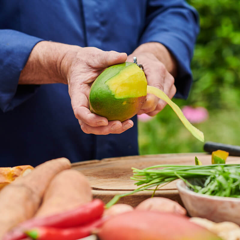 2. Tuo tarpu čatniui nulupkite ir susmulkinkite šalotinius svogūnus. Nulupkite saldžiąją bulvę ir supjaustykite ją maždaug 5 milimetrų kubeliais. Nulupkite imbierą ir smulkiai supjaustykite jo minkštimą. Iš aitriosios paprikos išimkite kotelį ir sėklas ir smulkiai supjaustykite likusią dalį. Nulupkite mangą ir atskirkite minkštimą nuo kauliuko. Supjaustykite minkštimą maždaug 5 milimetrų kubeliais.