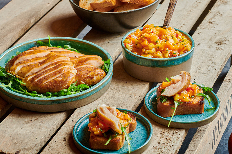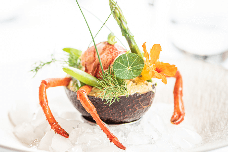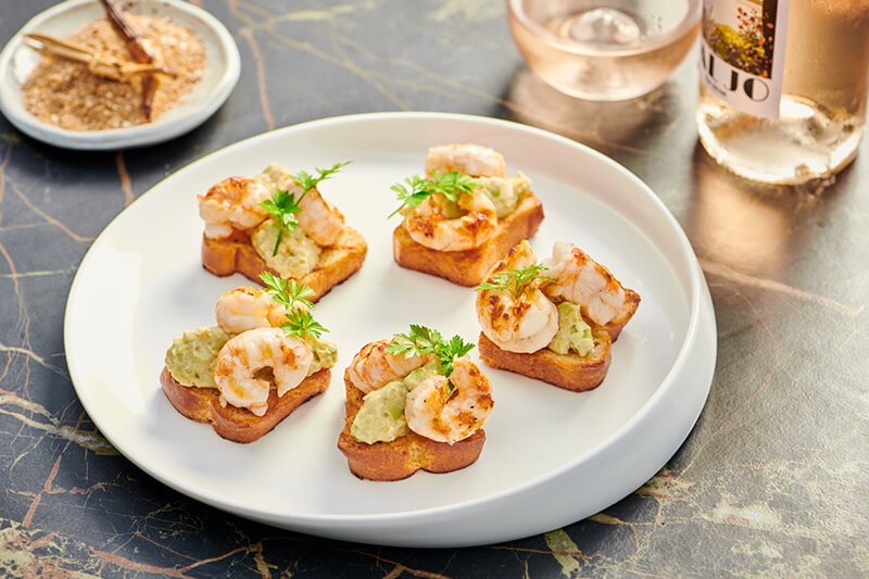 Duonos riekelės su avokadų salotomis ir keptais langustinais