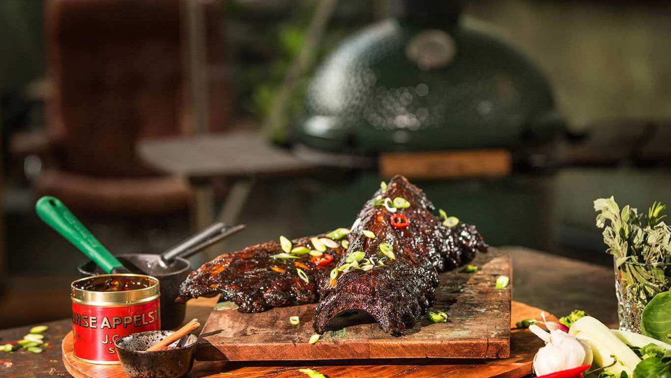 Išimkite šonkauliukus iš Big Green Egg kepsninės ir paskutinį kartą aptepkite aptepu. Apibarstykite šonkauliukus laiškiniais svogūnais ir sezamų sėklomis. Dėl marinato šonkauliukai gali pasirodyti patamsėję, bet išvaizda neturi jokios įtakos skoniui. Skanaus!