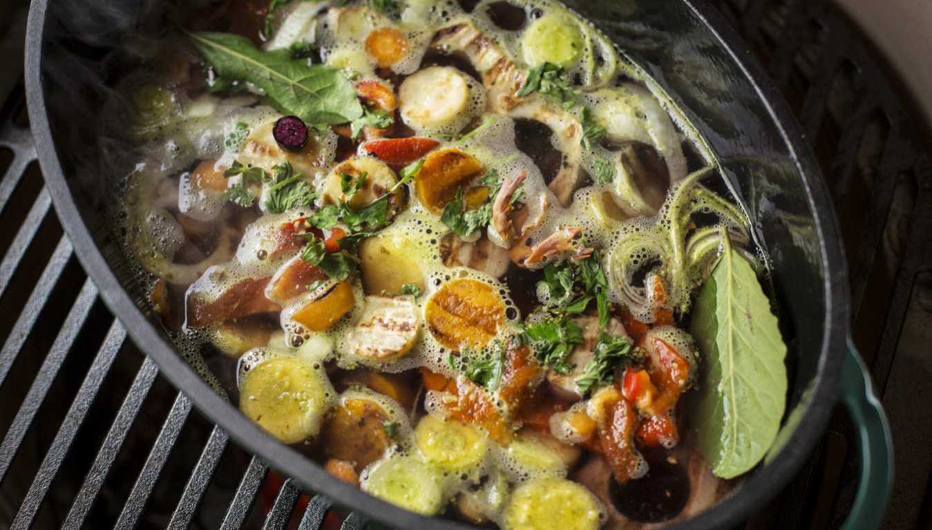 2. Išimkite keptas daržoves iš Big Green Egg kepsninės ir palikite pravėsti. Įdėkite į kepsninę antras pusapvales ketaus groteles ir ant jų užkelkite ketaus puodą. Įpilkite į jį 1,5 l karšto vandens ir sudėkite daržovių sultinio kubelius. Uždarykite kepsninės dangtį.
