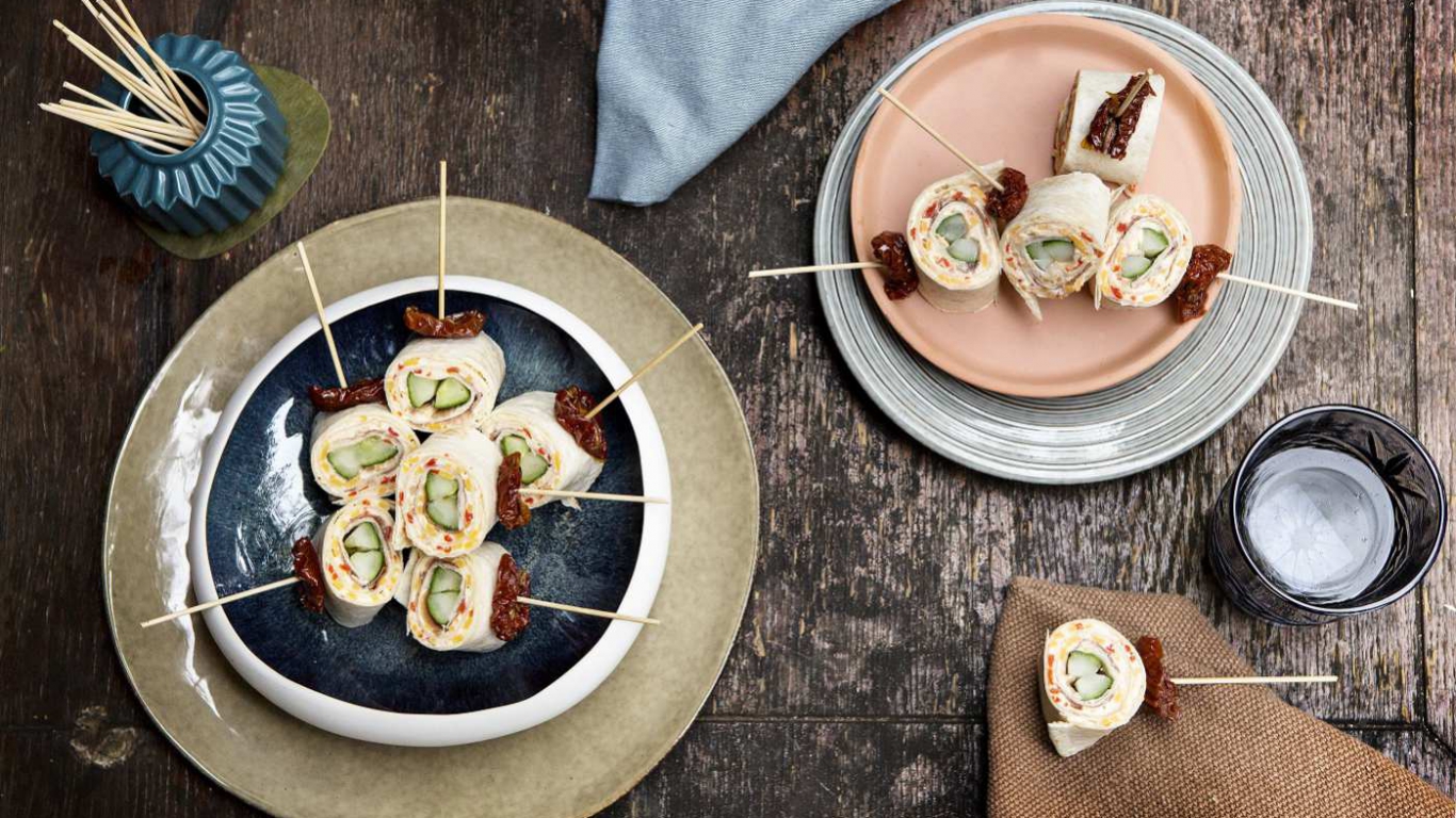 4. Saulėje džiovintus pomidorus sumaukite ant maždaug 7 dekoratyvių iešmelių ir tolygiai paskirstę susmaigstykite į vyniotinius. Gautus vyniotinius dailiai supjaustykite gabalėliais.