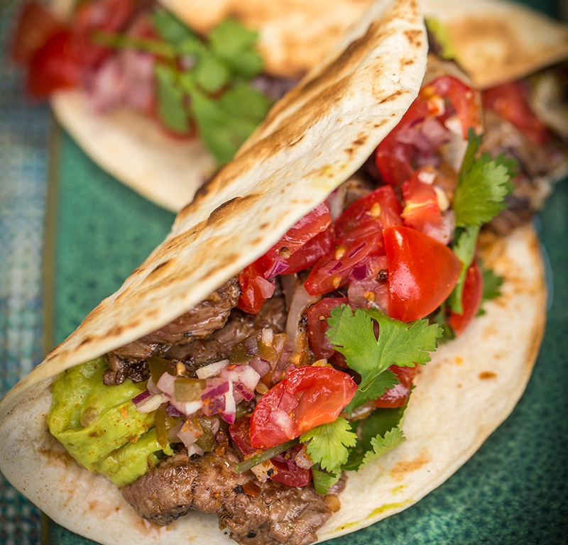 3. Išimkite iš kepsninės mėsą ir ketaus plokštę. Išdėliokite ant grotelių 3 tortilijas ir kepkite 30–60 sek., kol jos pradės pūstis. Nepamirškite uždaryti Big Green Egg kepsninės dangčio. Išimkite tortilijas iš kepsninės ir perlenkite pusiau. Tai darykite nedelsdami, nes pravėsusios tortilijos gali lūžti. Į tortilijas gausiai įdėkite gvakamolės, padalykite pusę keptų svogūnų ir jautienos. Ant viršaus uždėkite 2 valg. š. pico de gallo pagardo ir patiekite. Taip pat paruoškite likusius takus.