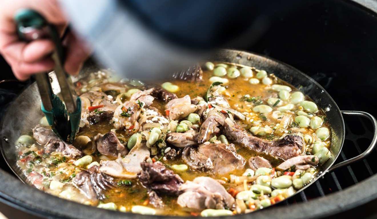 Uždekite Big Green Egg kepsninėje anglis ir, įdėję ketaus groteles, įkaitinkite iki 200 °C. Tuo tarpu stambiai supjaustykite triušį. Vištienos šlaunelių filė susmulkinkite kubeliais. Nulupkite ir smulkiai sukapokite svogūnėlius bei česnako skilteles. Išaižykite pupas, o aitriąją papriką supjaustykite plonais pusžiedžiais. Nuskabykite rozmarinų bei raudonėlių lapelius ir smulkiai sukapokite.