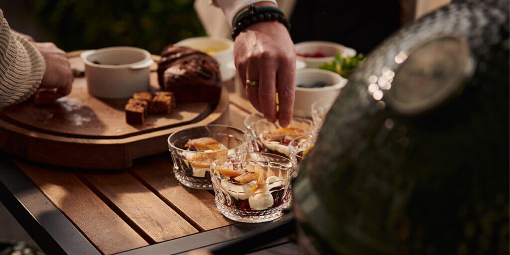 Ar mėgstate klasikinį anglišką trifle? Tuomet ši „Big Green Egg“ 2.0 versija su karamelizuota kriauše ir bananų duona yra privaloma Jūsų meniu. Visas deserto dalis galite paruošti kamado kepsninėje iš anksto. Kriaušę geriau kepti ant grotelių dieną prieš, kad cukraus sirupas gerai įsigertų į kriaušę. Šį desertą netgi galite surinkti kelios valandos iš anksto, jei norite. Tokiu būdu šį desertą patieksite akimirksniu.