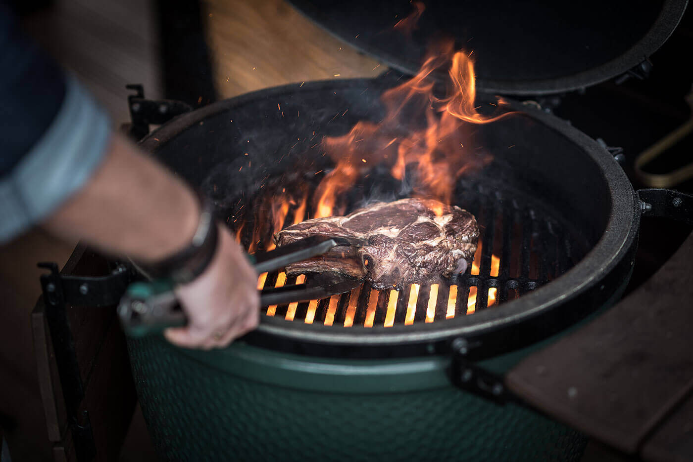 Riebalais ištrinkite groteles, ant jų uždėkite antrekotą, o ant mėsos – nupjautus riebalus. Uždarykite EGG kepsninės dangtį ir 30 min. kepkite mėsą nedidelėje temperatūroje.