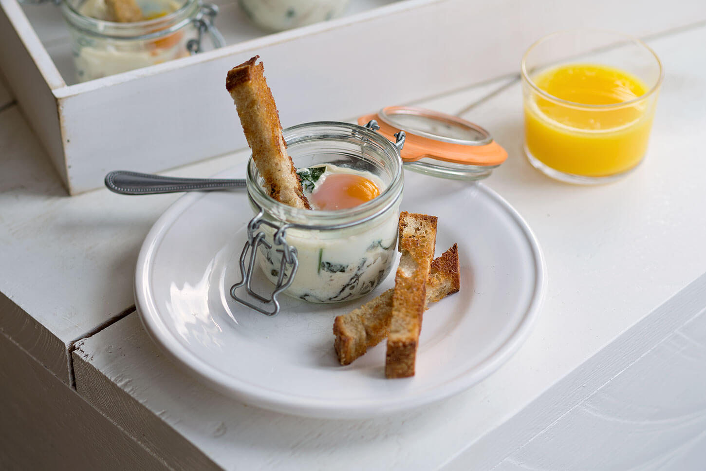 Išimkite pusmėnulio formos ketaus groteles. Pakelkite nerūdijančio plieno groteles, įdėkite convEGGtor laikiklį ir ant jo vėl uždėkite groteles. Sudėkite stiklainius į apvalią skysčių surinkimo talpą, ją uždėkite ant grotelių ir atsargiai pripilkite verdančio vandens, kad talpa būtų beveik pilna. Uždarykite EGG kepsninės dangtį ir kepkite 15–20 minučių maždaug 130 °C temperatūroje. Įdėjus convEGGtor laikiklį temperatūra turėtų nukristi iki tokio lygio. Patiekalas bus gatavas, kai kiaušiniai iškeps.